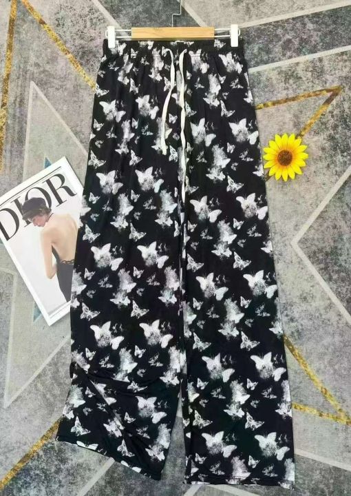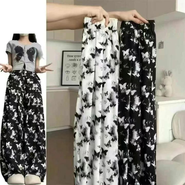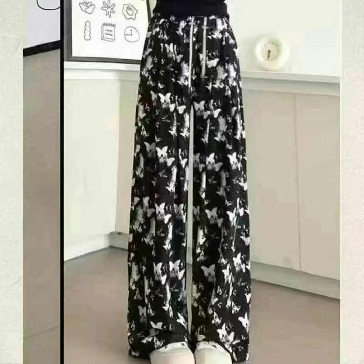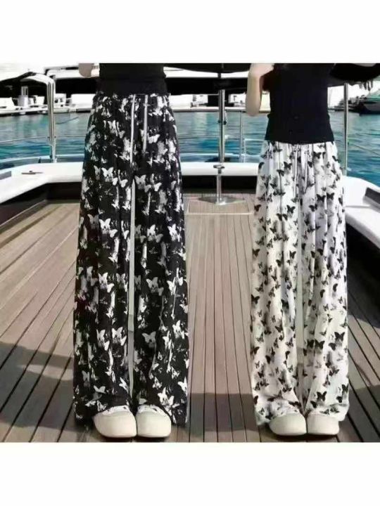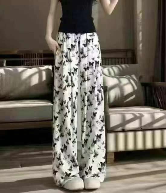 新中式水墨蝴蝶冰丝阔腿裤夏季国风裤女薄款休闲垂感直筒拖地裤子,垂感好,面料柔软舒适,夏天穿它凉感十足[哇],松紧腰不挑人,全部全新独立包装,品质,200件起分货[太阳]9.8