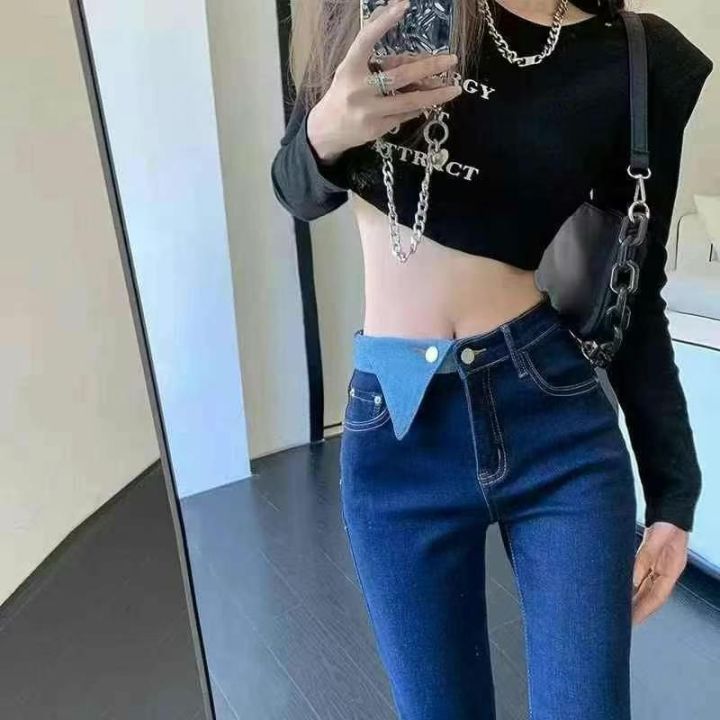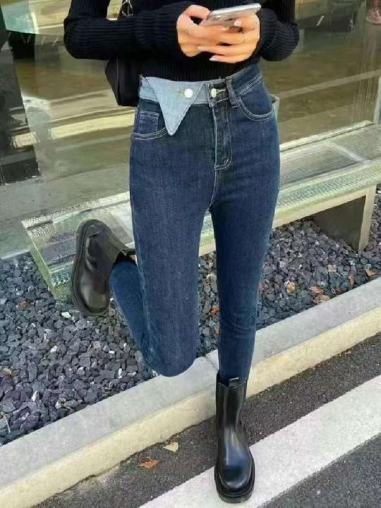 高弹力牛仔小脚裤☕️50条全清11.8元码数S到5xl,撞色牛仔裤女春夏新款大码胖mm高腰显瘦炸街小直筒裤潮
