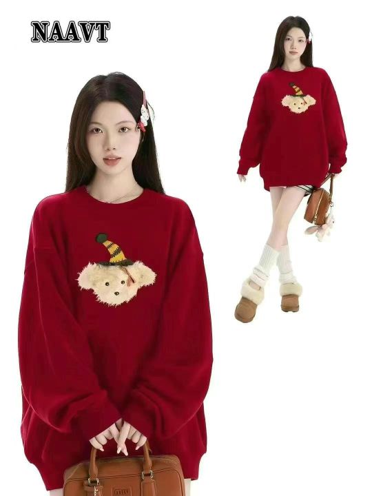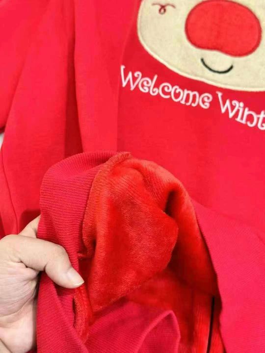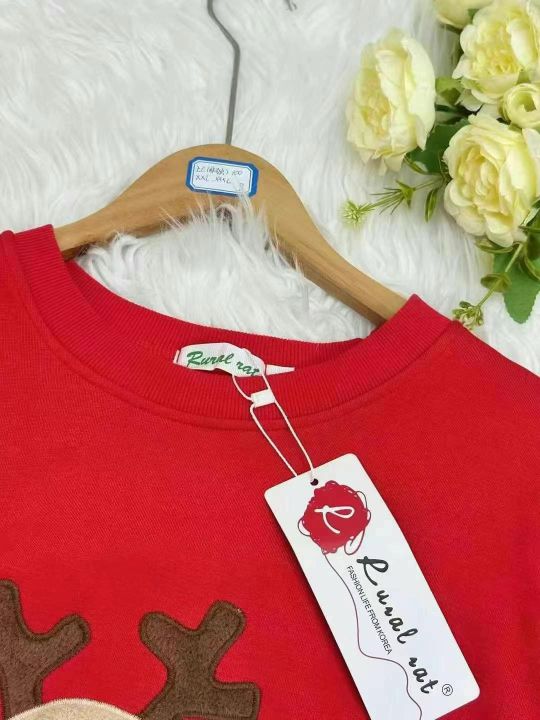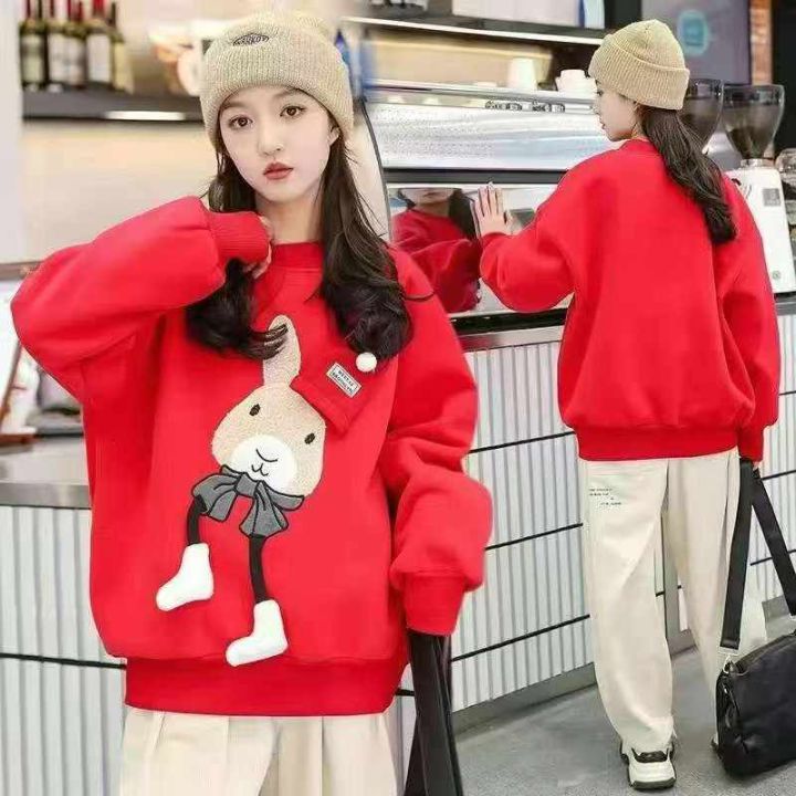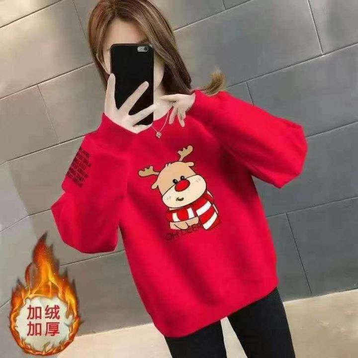 红色圆领无帽卫衣女秋冬季加绒加厚宽松潮流时尚显白上衣,超强加绒保暖,小鹿文案可爱有趣,绒毛锁封层结构蓬松,温暖亲肤触感,细腻柔暖,微弹包容性好,百搭休闲,易于打理,做工精细,显高显瘦修身,高性价比保暖选择,选它,最低价,超值得!100件起,分货11.8