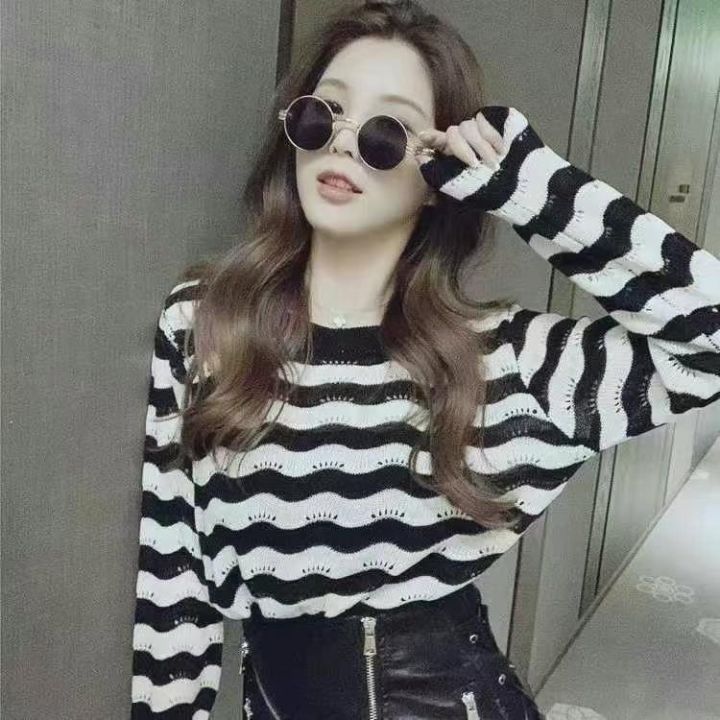 早秋新款宽松显瘦时尚条纹长袖镂空针织套头毛衣,独立...