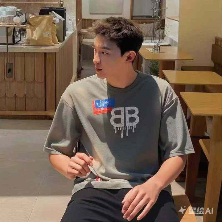 天猫 2025夏季新款复古潮牌印花半袖双b短袖情侣款宽松...