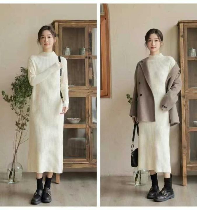 半高领内搭针织连衣裙女秋冬修身温柔气质开叉毛衣温柔...