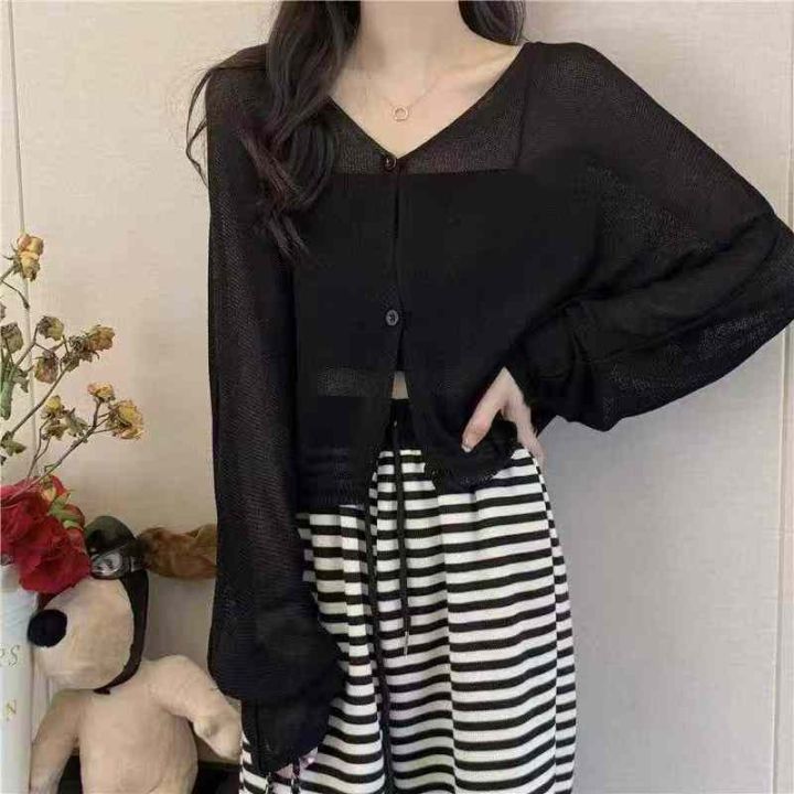 夏季新款冰丝韩系穿搭净版简约宽松纯色针织长袖开衫,...