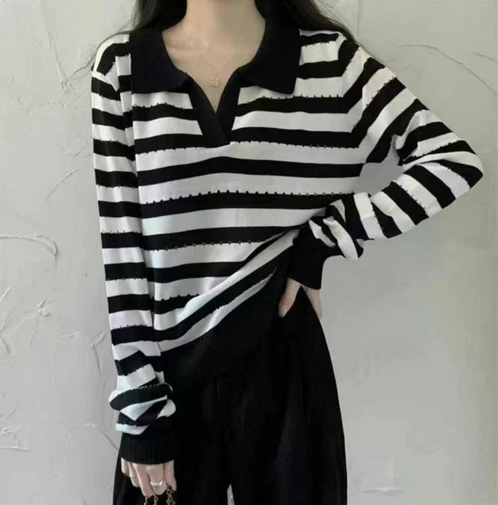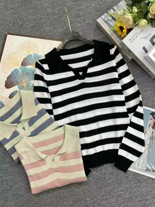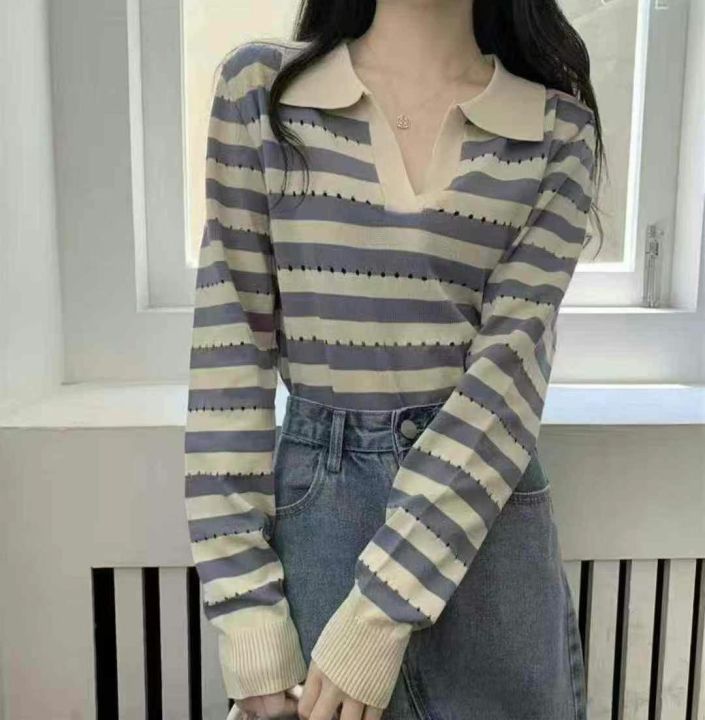初秋新款复古设计感镂空条纹polo领针织套头毛衣,独立...