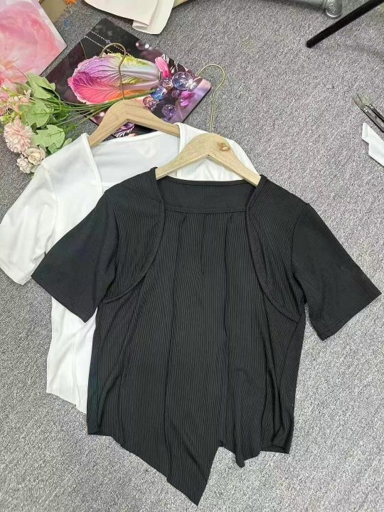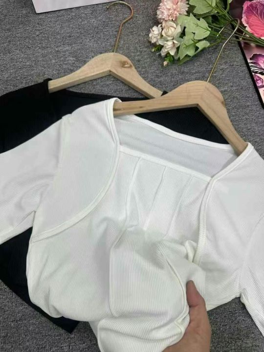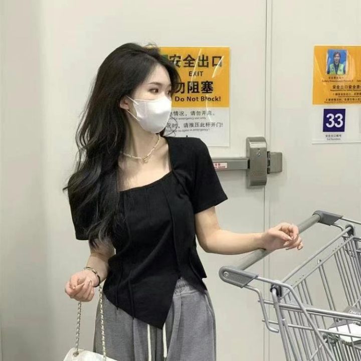 冰丝螺纹纯欲方领短袖t恤女2025夏季修身chic别致独特甜辣妹正肩短款上衣,1到6码,独立包装,货品干净,1400件左右,5.8清,分货加1