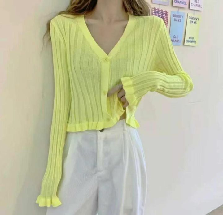 早秋新款薄款纯色洋气荷叶边v领长袖短款针织开衫,独...