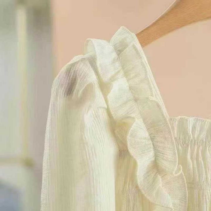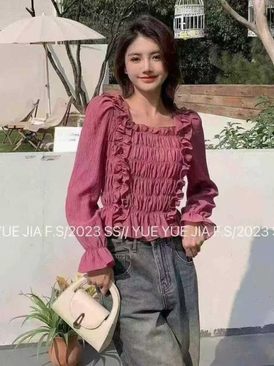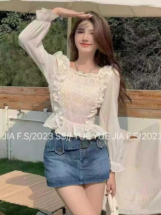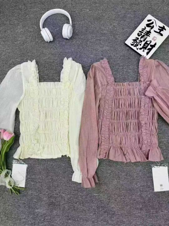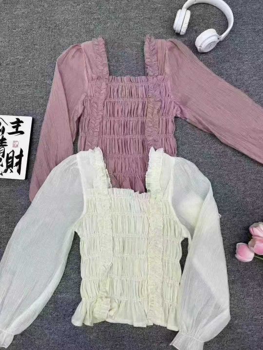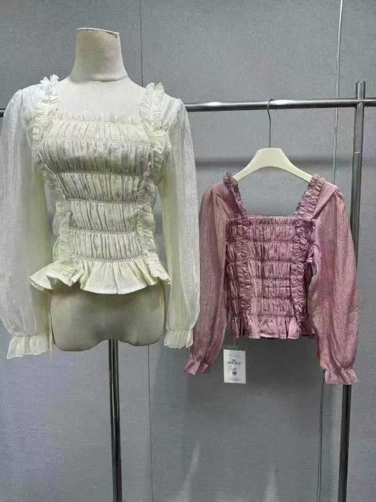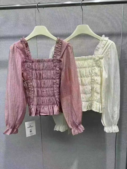 清300件,2025韩国夏装新款女装,气质花边设计,薄款上衣,法式修身显瘦方领t恤,洋气别致方领木耳边褶皱收腰显瘦雪纺衫,码数m-l。