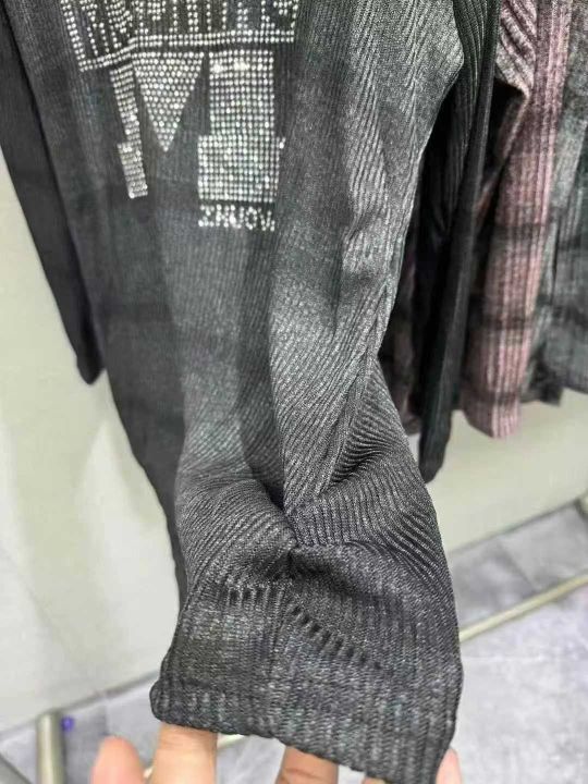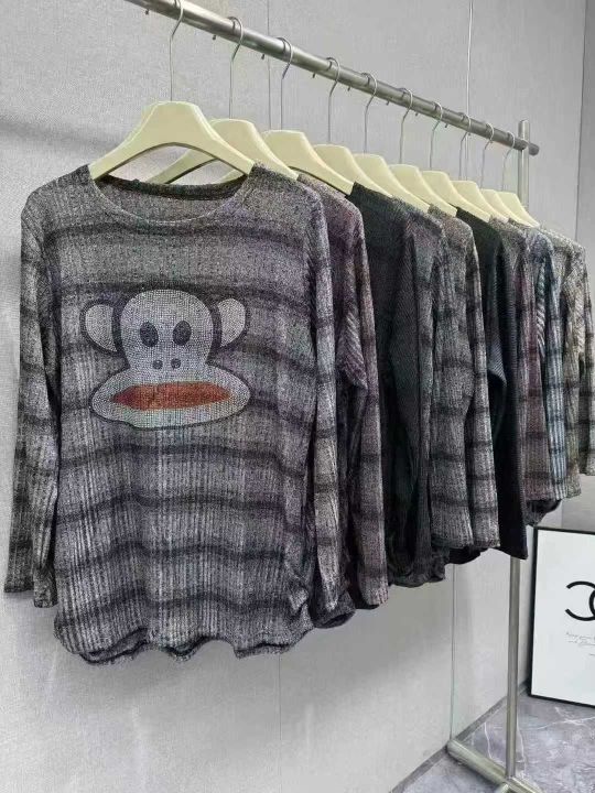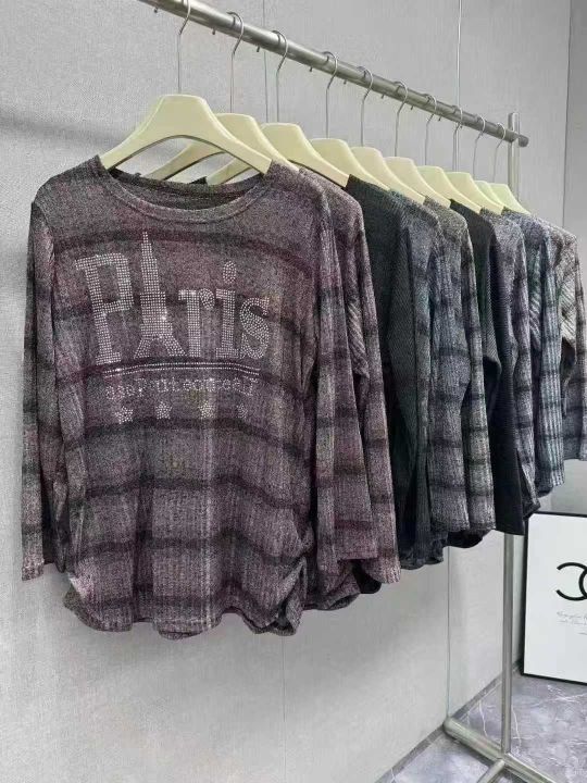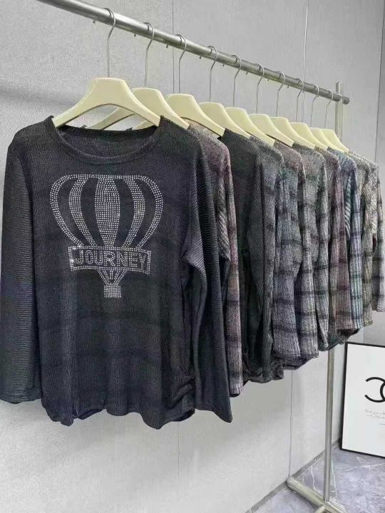 清2000件,圆领烫钻弹力大码长袖T恤女春季2025新款个性街头风宽松打底衫,两边下摆带褶皱设计,均码,图案很多。