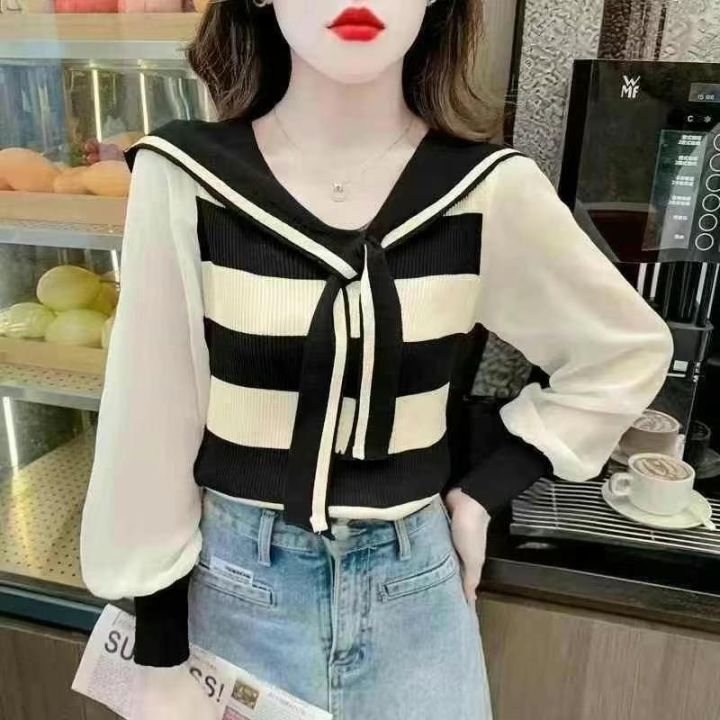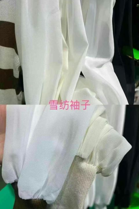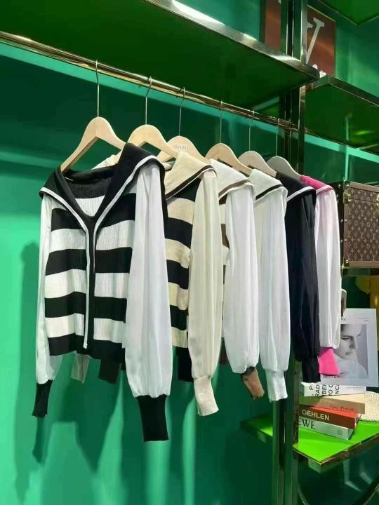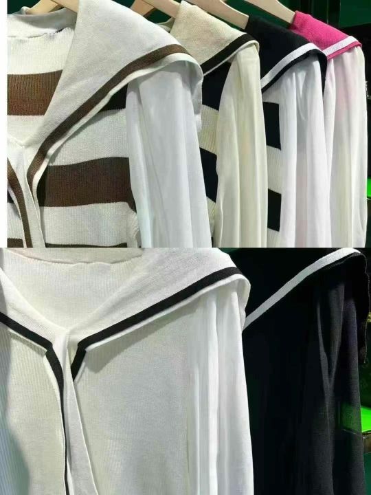 海军领系带披肩款拼接雪纺袖针织衫,数量1800件左右,均码,单款多色,衣身是针织面料,袖子是雪纺面料,独立包装吊牌,分货➕1随机配