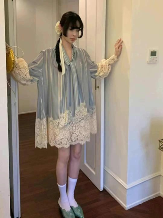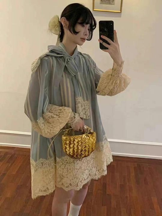 周雨彤庄洁同款法式重工拼接蕾丝连衣裙条纹衬衫裙女,...