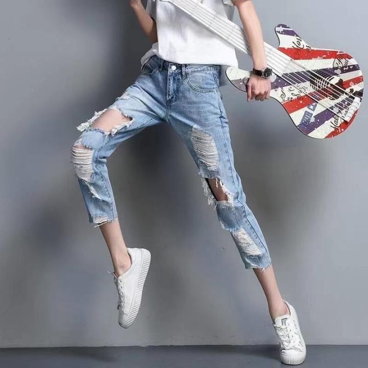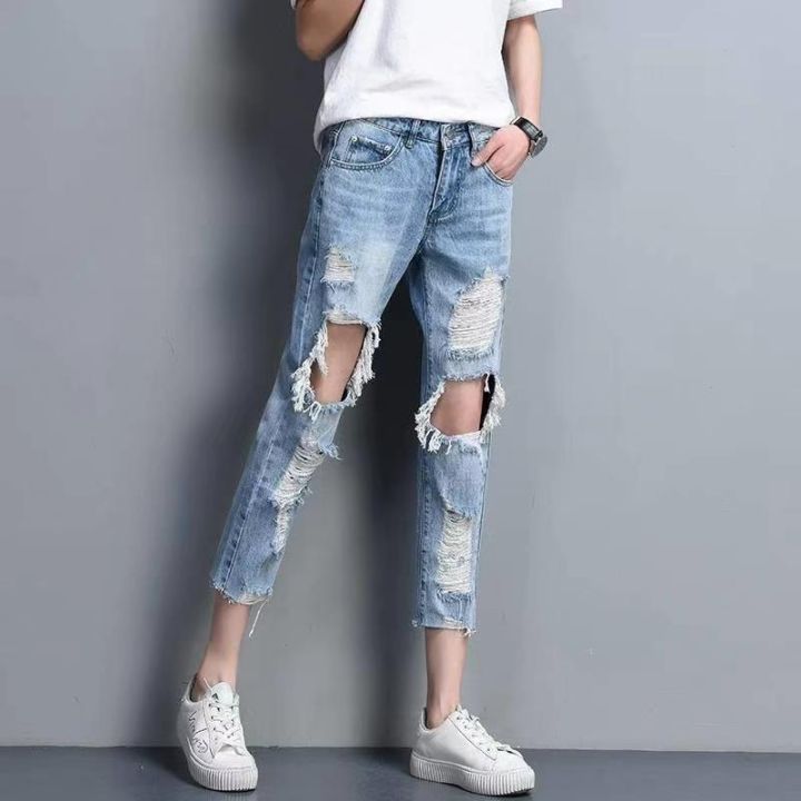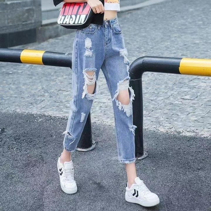 ☕️破洞牛仔九分裤女宽松春夏季韩版高腰显瘦哈伦乞丐...