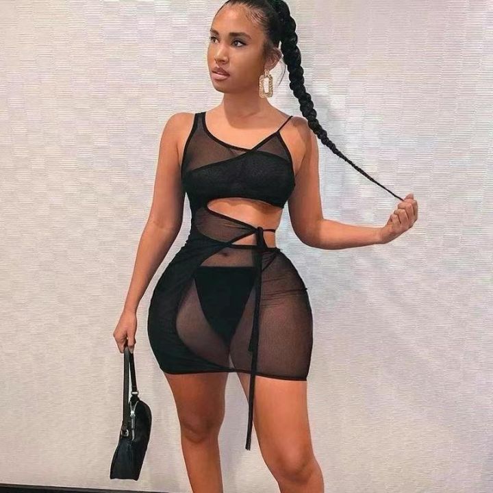 4.5清欧美外贸春夏新款纯色无袖镂空不规则性感网纱连...