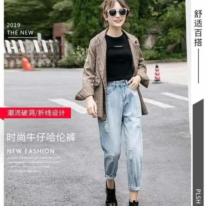 夏季破洞牛仔裤女宽松显瘦哈伦九分裤松紧腰大码老爹裤...