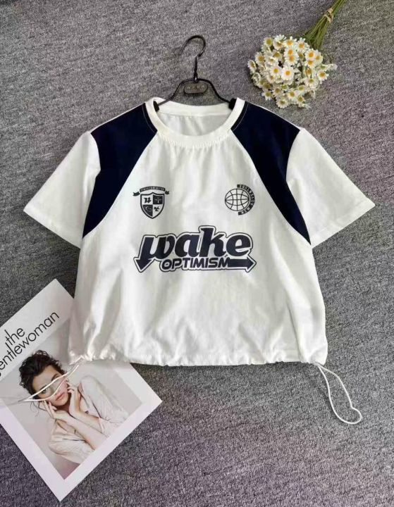 夏季潮流印花拼接短袖上衣,单款单色,下摆抽绳收腰设...