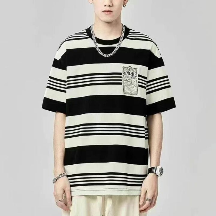 210件高街美式徽章条纹短袖t恤男夏季潮牌落肩宽松百搭休闲半袖情侣上衣!