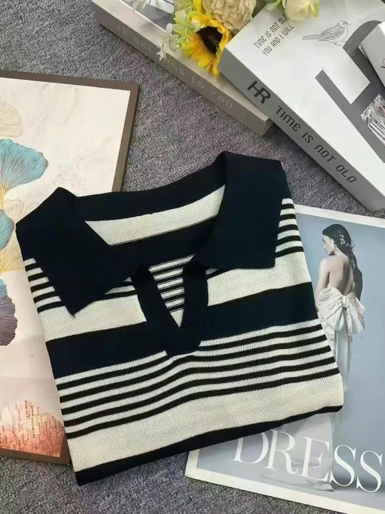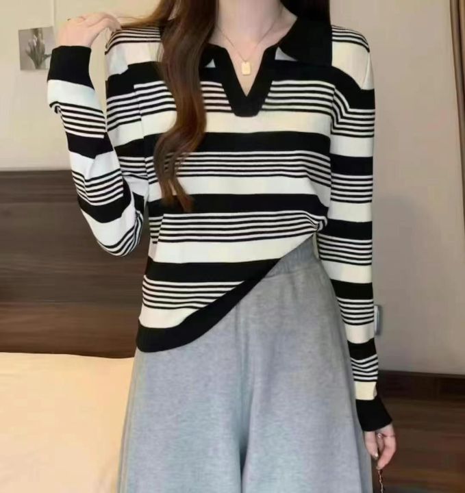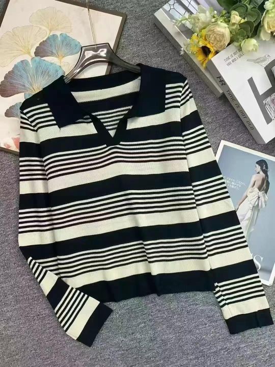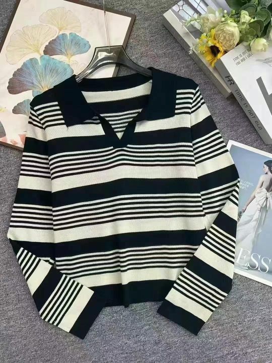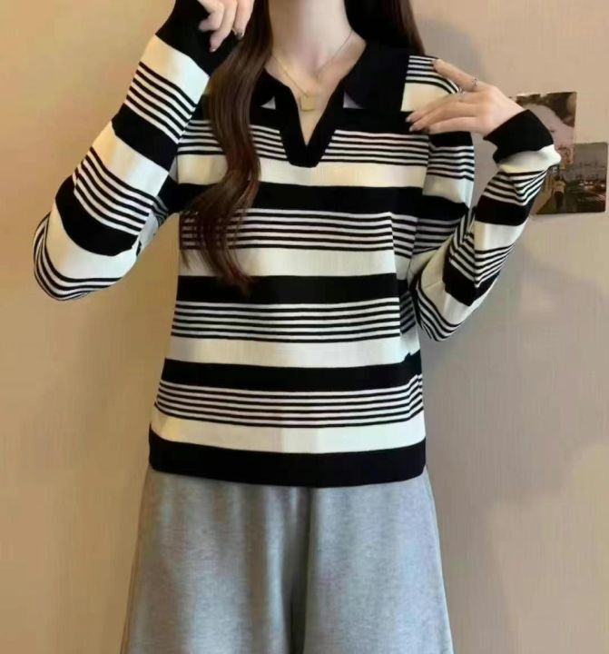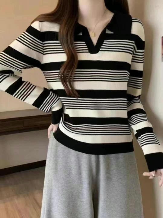 早秋新款韩版正肩翻领polo领撞色条纹长袖针织套头毛衣...