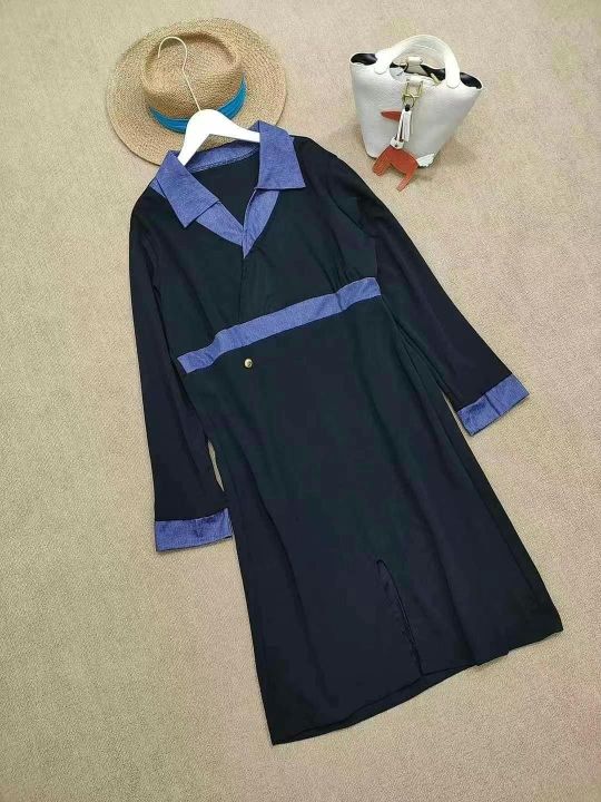 [月亮]:仿牛仔拼接V领通勤休闲连衣裙