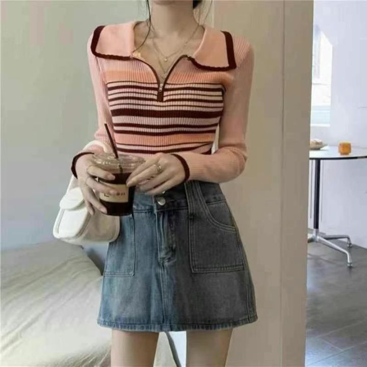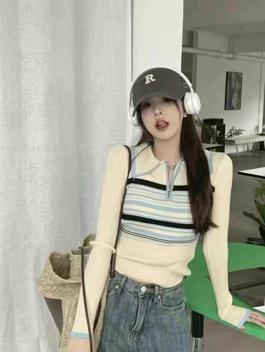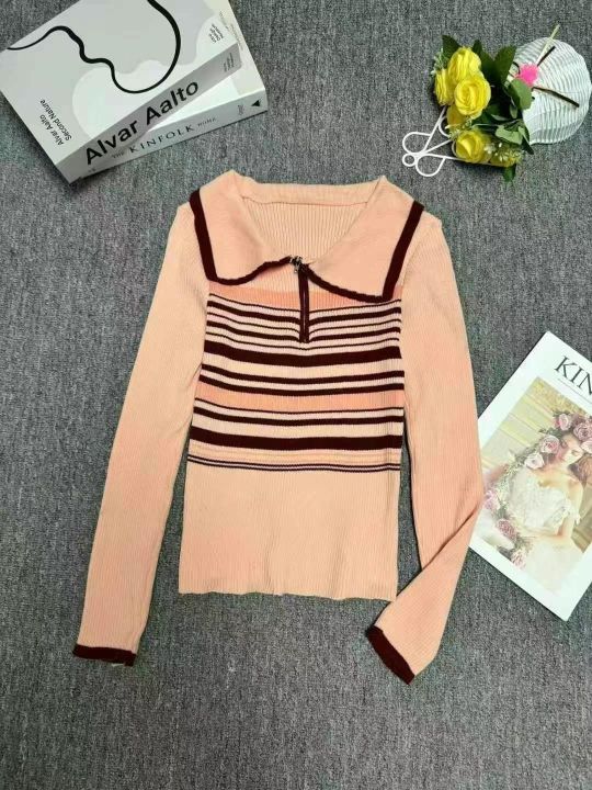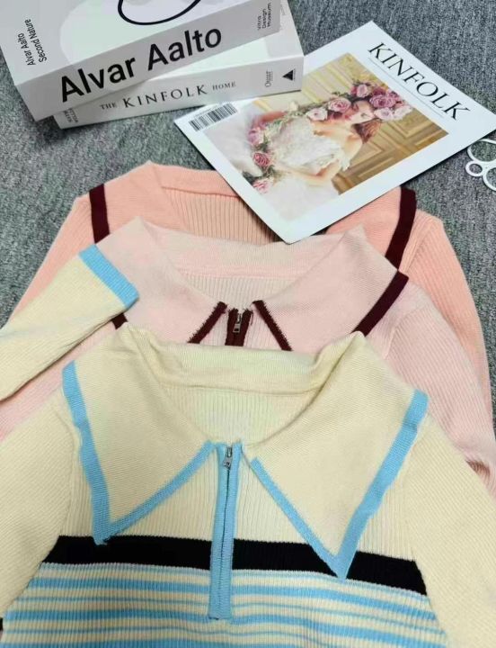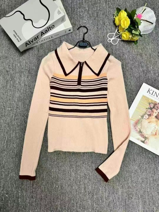 拉链polo领撞色条纹正肩长袖修身显瘦毛衣,图片款,高弹力,品质好独立包装,均码,410件,清8.9,分➕1