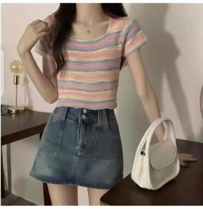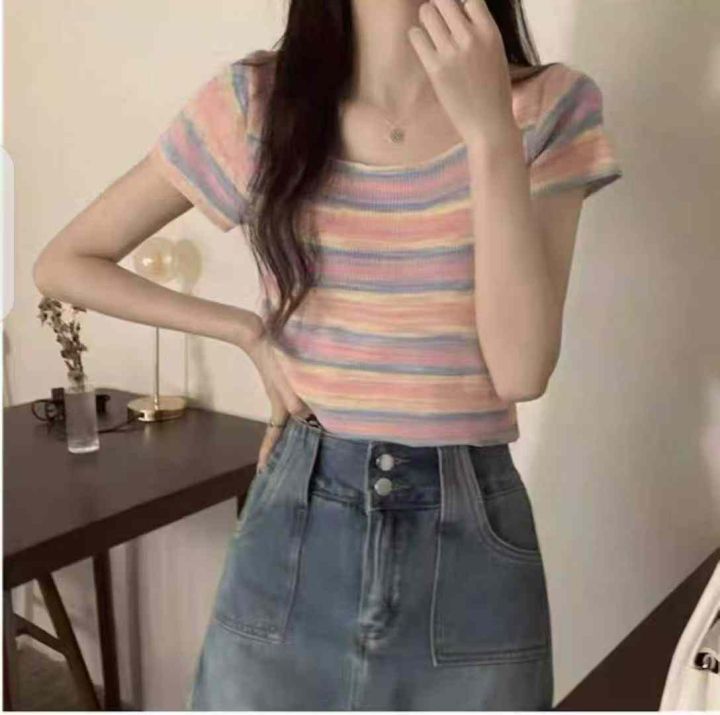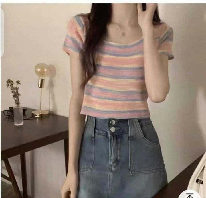 夏季新款甜辣方领彩虹条纹冰丝针织短袖T恤,独立包装...