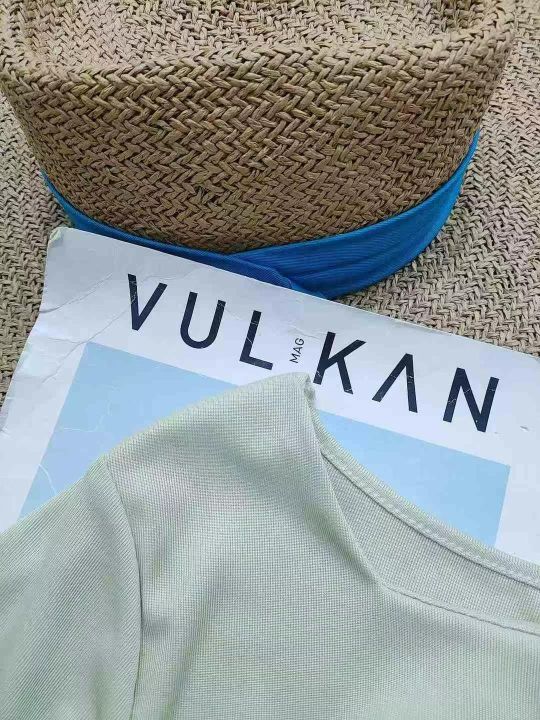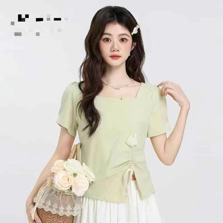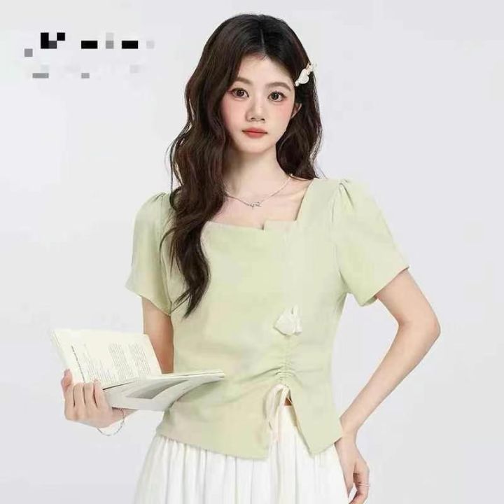 [月亮]:韩系甜美不规则褶皱抽绳上衣