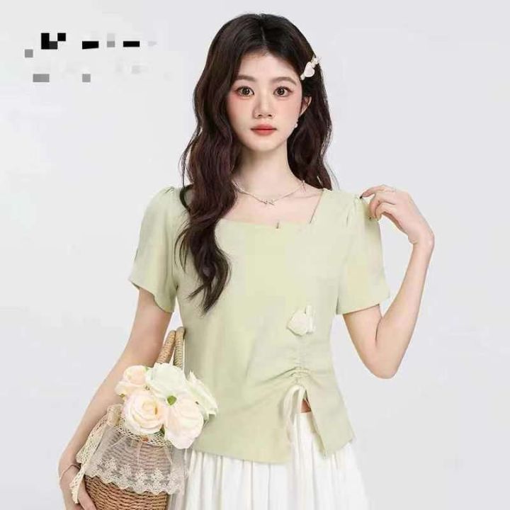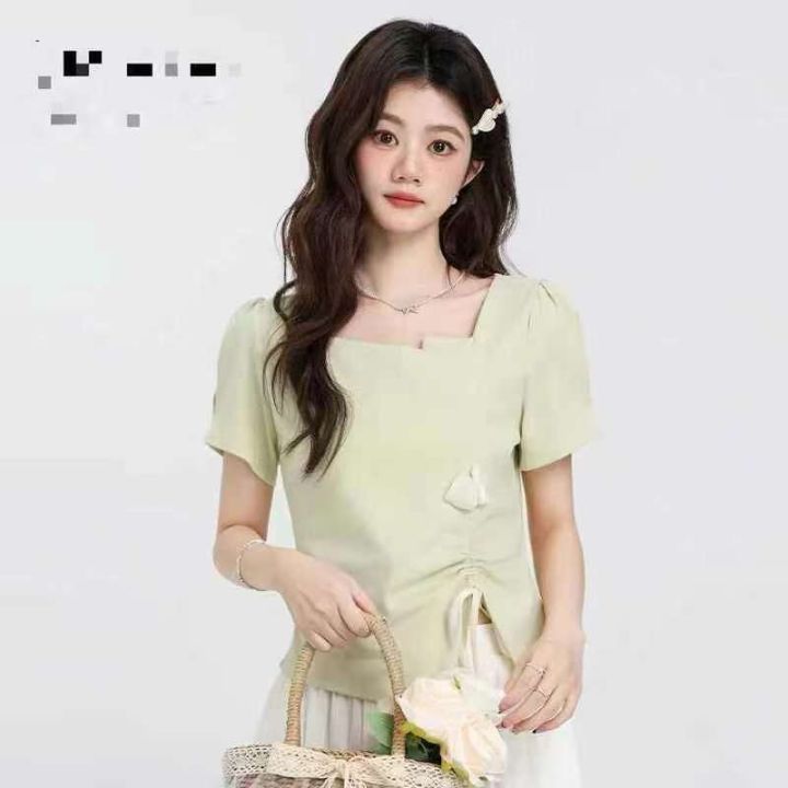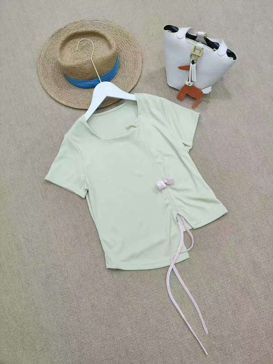 [月亮]:韩系甜美不规则褶皱抽绳上衣