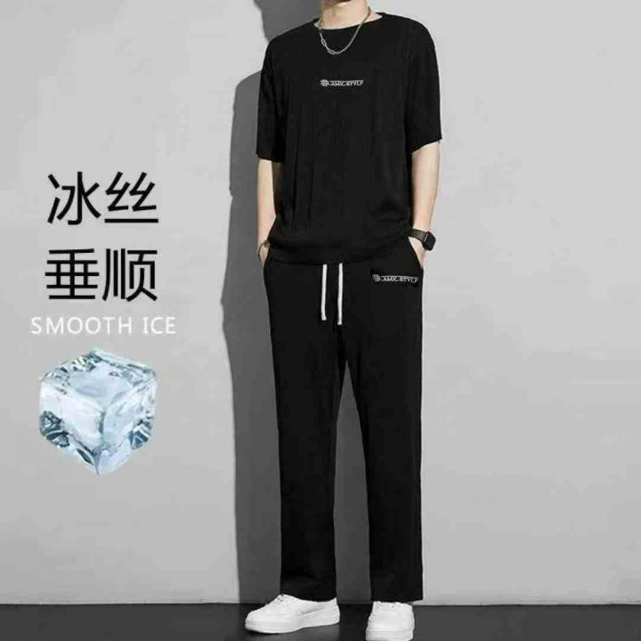 全清价11.8冰丝运动套装男士帅气夏季休闲长裤子短袖t恤ins速干垂感套裤,独...