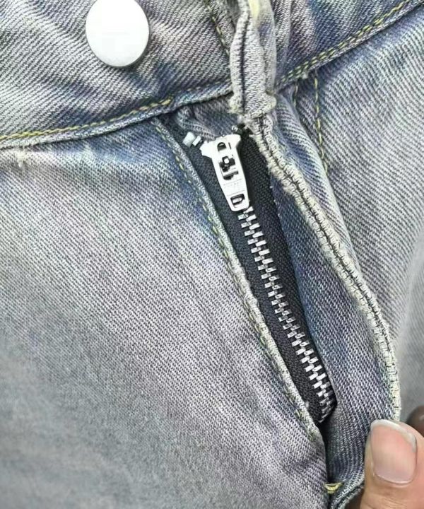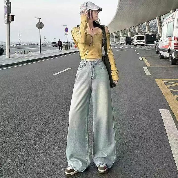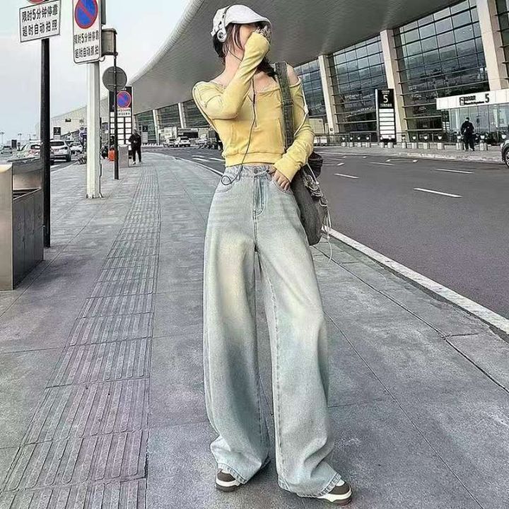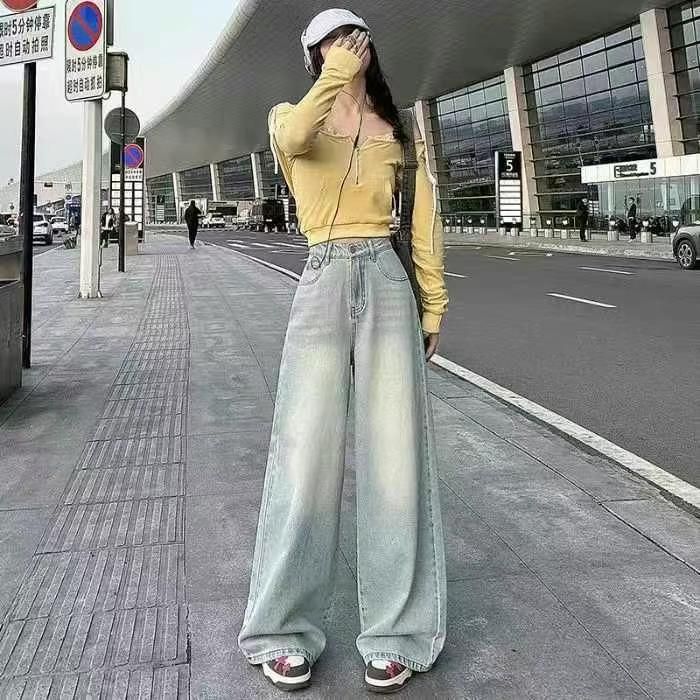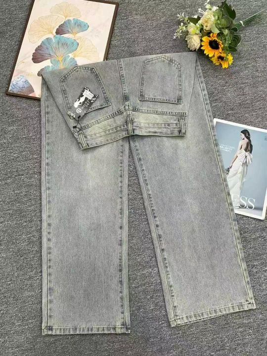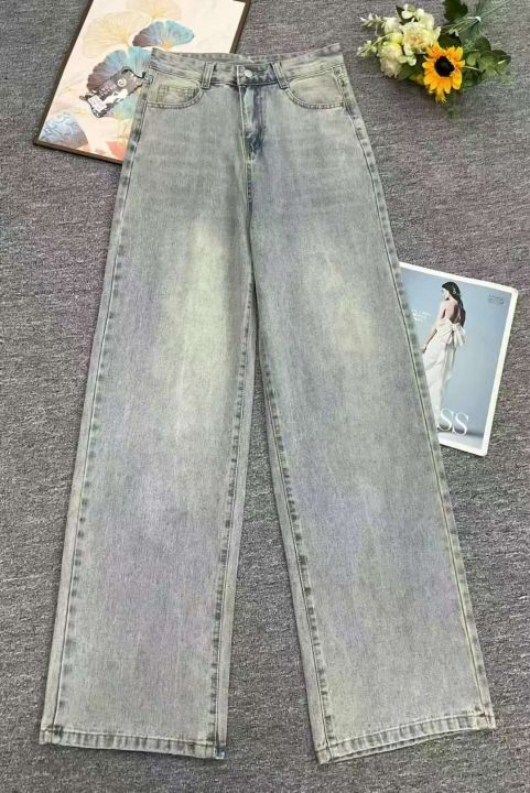春夏新款洗水棉复古蓝直筒阔腿牛仔长裤,独立包装带吊...