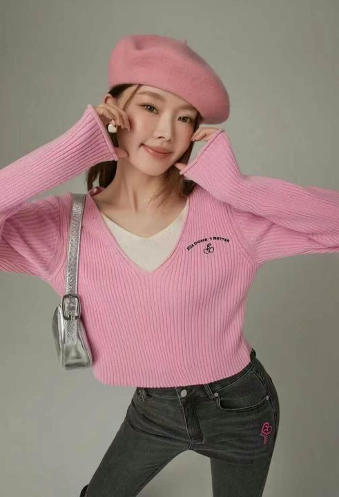 早秋新款女装假两件拼接字母刺绣长袖针织衫,独立包装...