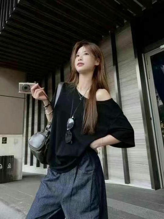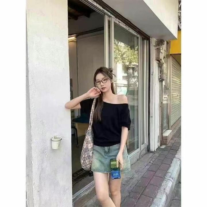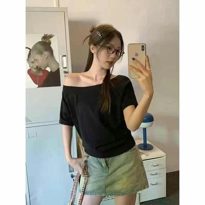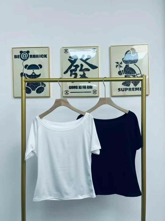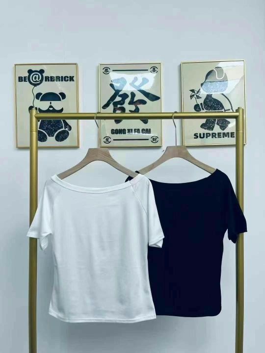 天猫在售218件冰丝螺纹斜肩一字肩短袖t恤女新款夏上衣,单款两色,码数S-XL,独立包装