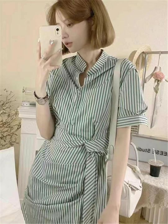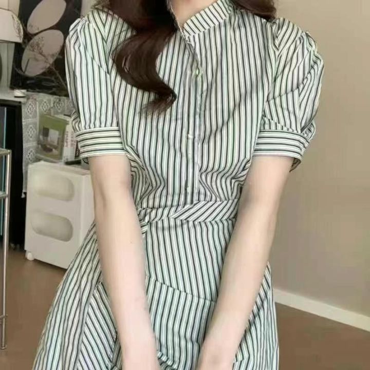 夏季薄款没计感气质收腰不规则条纹连衣裙,面料棉质平...