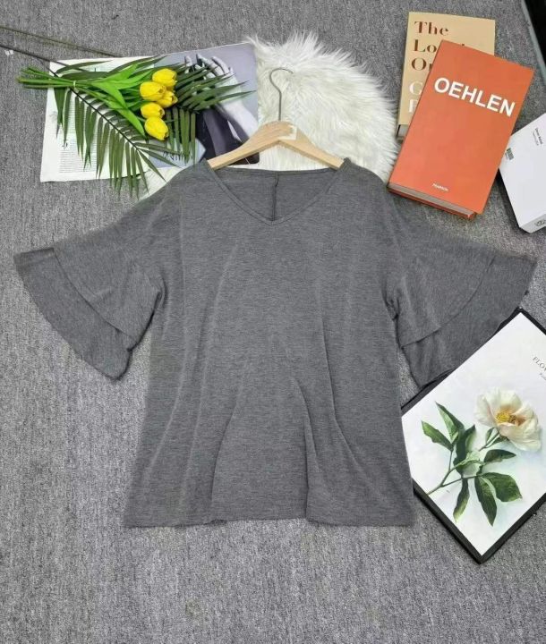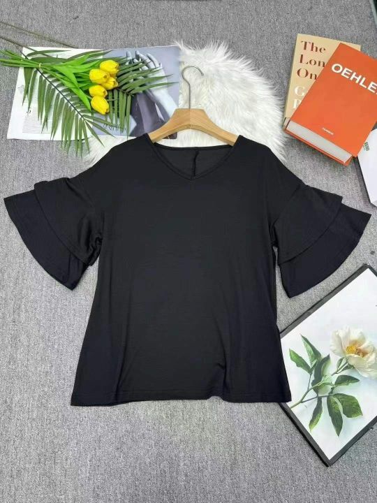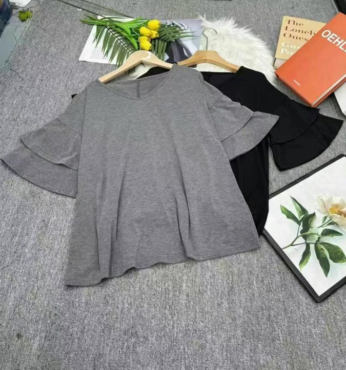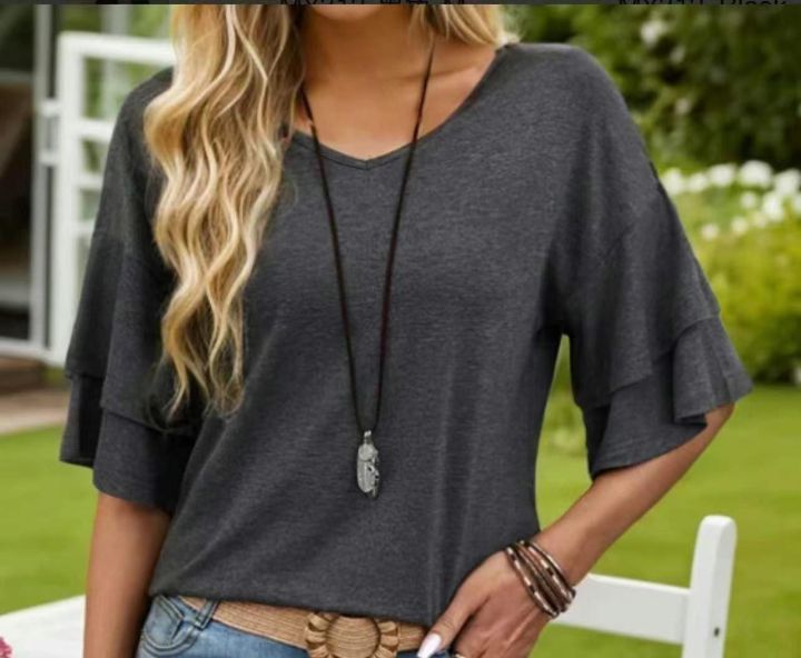 亚马逊跨境外贸,女高级感大码女装遮肚子荷叶边V领女夏季胖妹妹宽松百搭薄款衫,114件。码数S-5XL,两个款,面料柔软舒服,独立包装