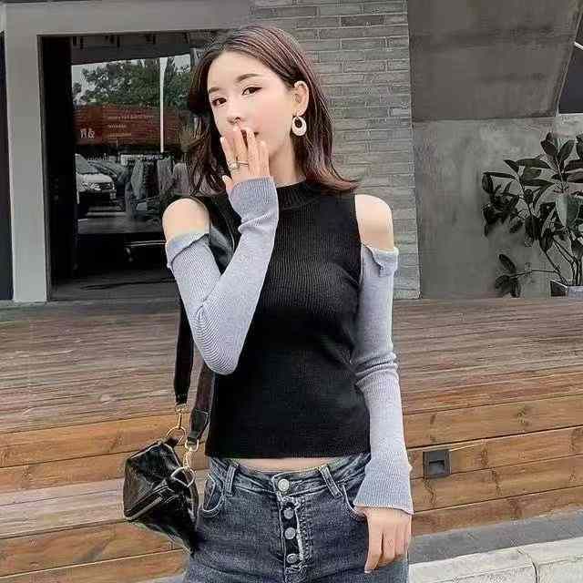 春季新款韩系设计感小众性感露肩长袖针织套头毛衣,独...