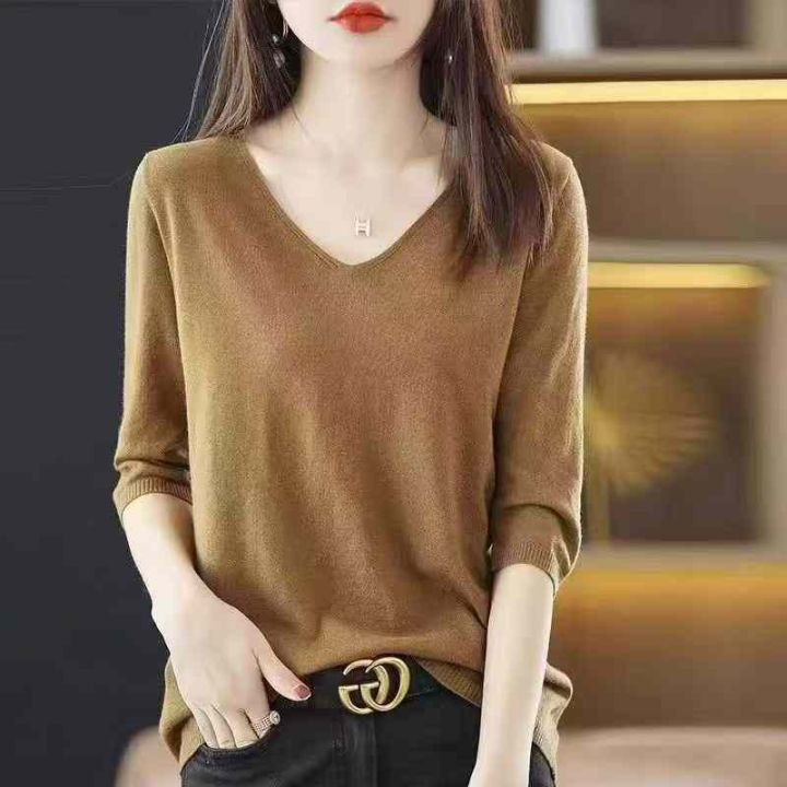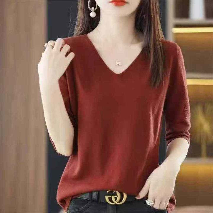 春夏季新款女装简约净版宽松气质V领包芯纱针织套头毛...