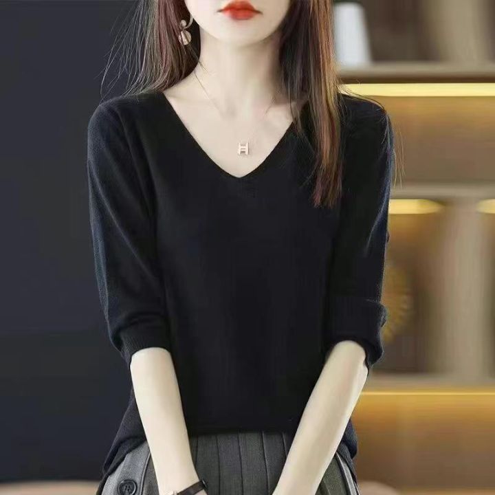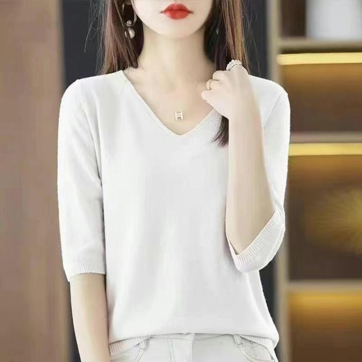 春夏季新款女装简约净版宽松气质V领包芯纱针织套头毛...