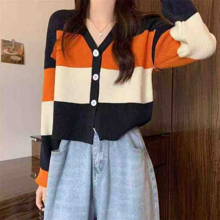 秋冬新款宽松慵懒风百搭撞色条纹针织毛衣开衫,独立包装,均码面料软糯舒适...