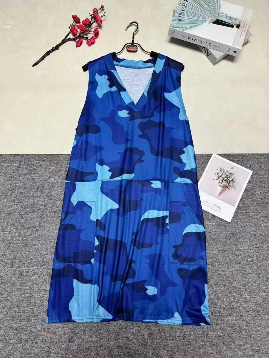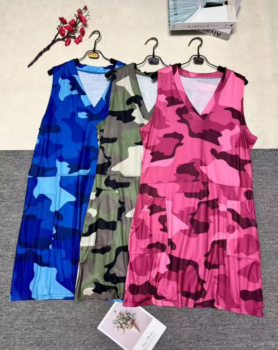 欧美女装春夏季新品 休闲时尚个性无袖迷彩连衣裙,整款三色,数量400条,码数S-2XL,高弹力品质好,拉链式独立包装。