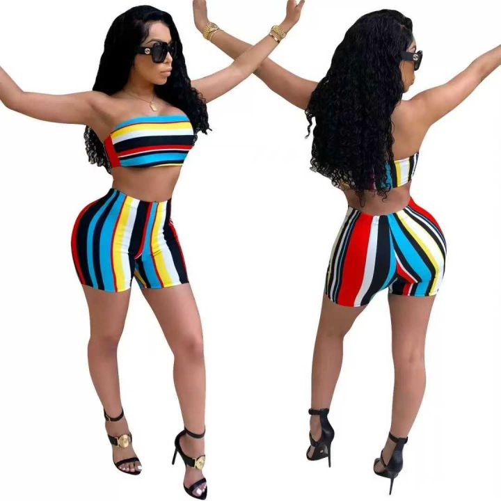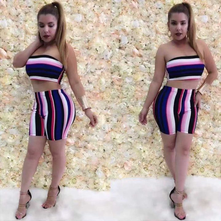 欧美性感抹胸短裤条纹套装,整款两色,数量210套,码数S-2XL,高弹力品质好,拉链式独立包装。