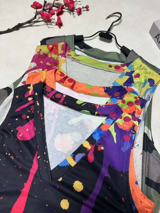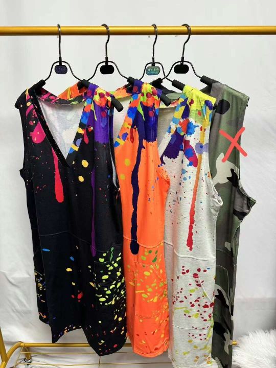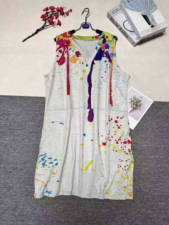 欧美女装V领印花无袖连衣裙,整款多色,数量200条,码数S-2XL,拉链式独立包装。