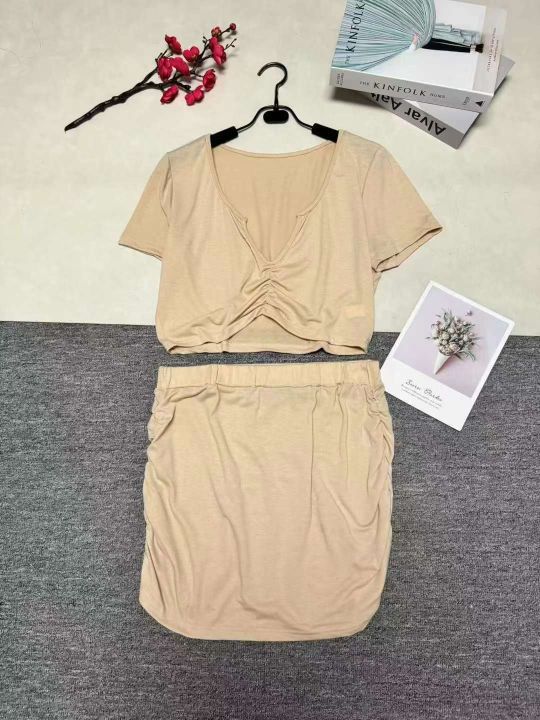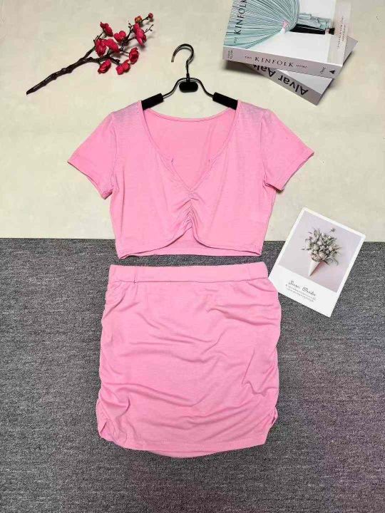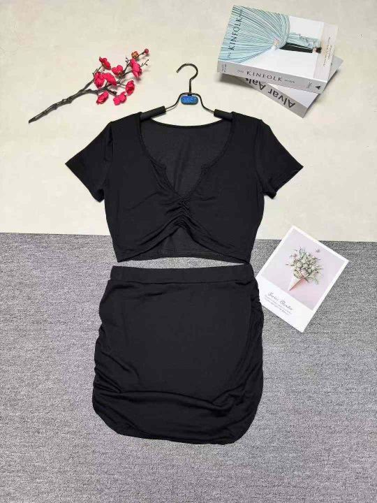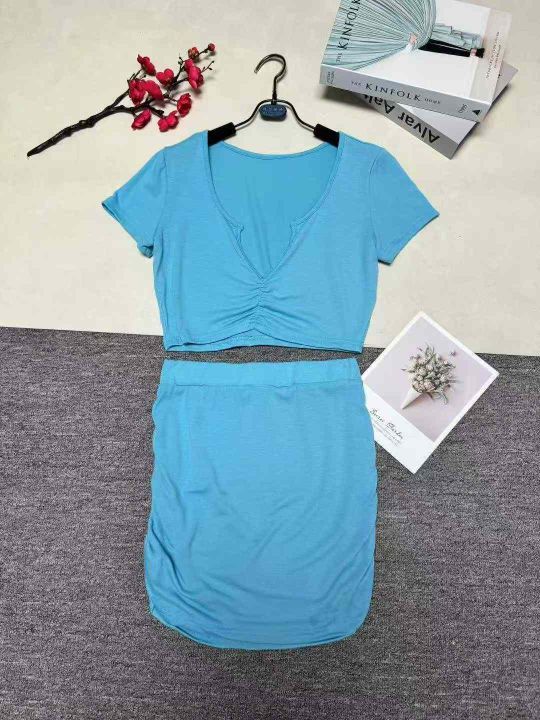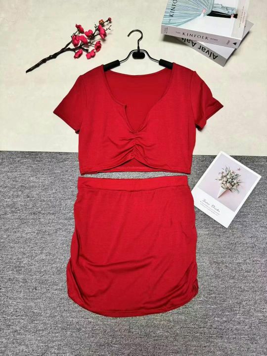 性感纯欲辣V领百搭显瘦短袖上衣褶皱半身裙套装,整款多色,数量290套,码数S-2XL,高弹力品质好,拉链式独立包装。