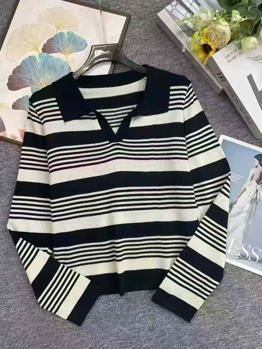 捡漏款,早秋新款韩版正肩翻领polo领撞色条纹长袖针织套头毛衣,独立包装,均码宽松款,面料软糯舒适,50件,全清6.9元超低价秒杀!