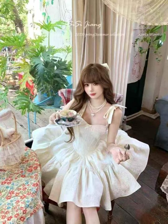 蝴蝶结肩带连衣裙夏短款a字蓬蓬温柔风法式初恋裙,实物图为准,码数S-XL,数量128件