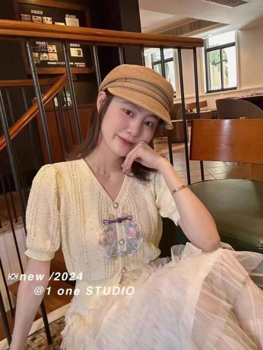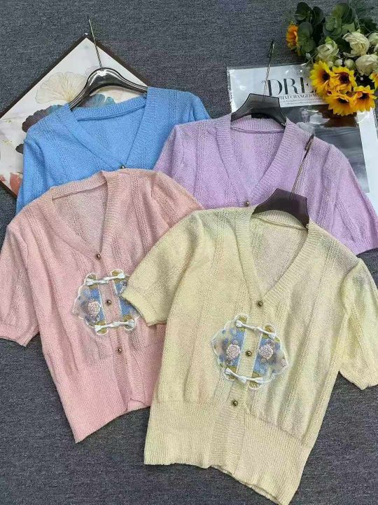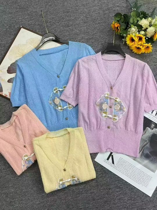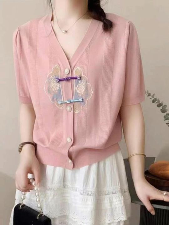捡漏款,夏季新款国风复古刺绣v领短袖针织开衫,独立...