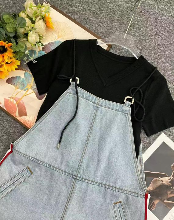 捡漏款,夏季新款女装针织短袖小衫+洗水棉牛仔背带短...