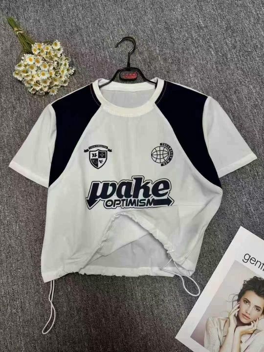 夏季潮流印花拼接短袖上衣,单款单色,下摆抽绳收腰设...