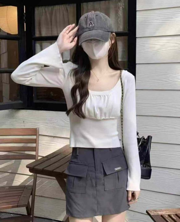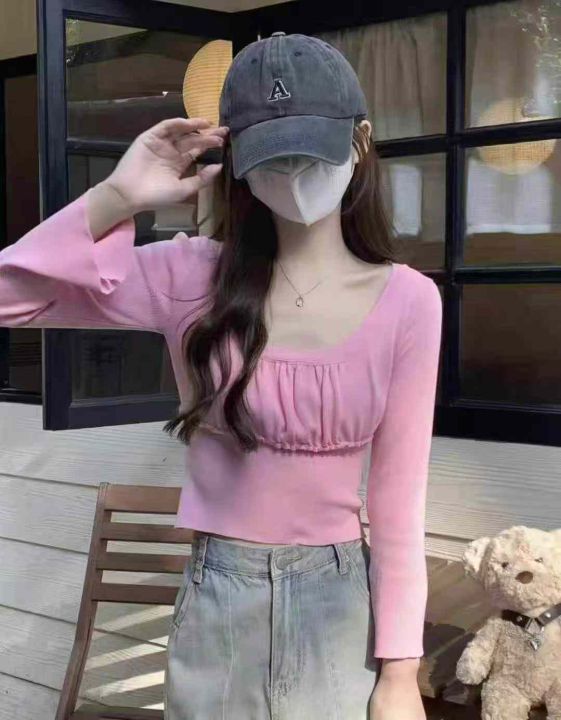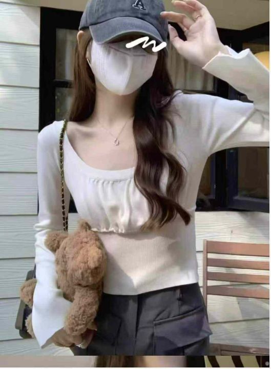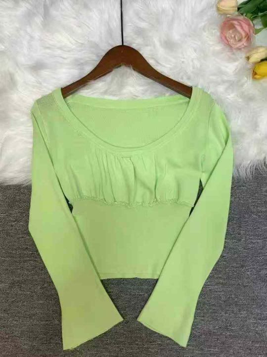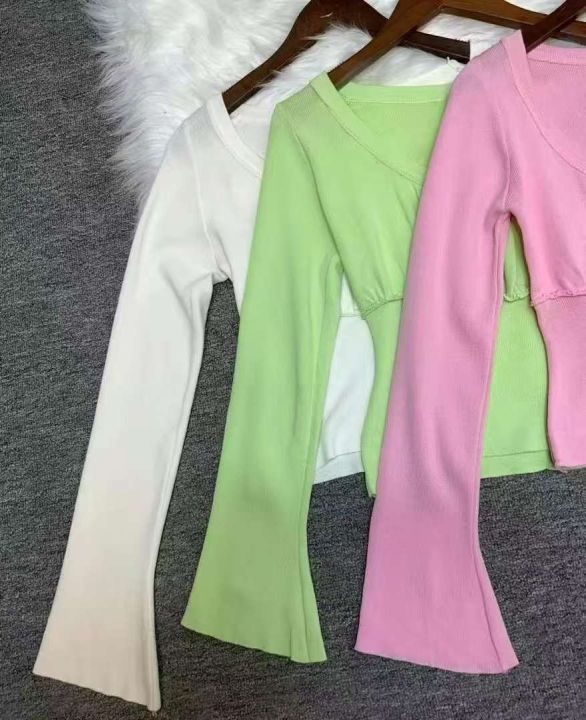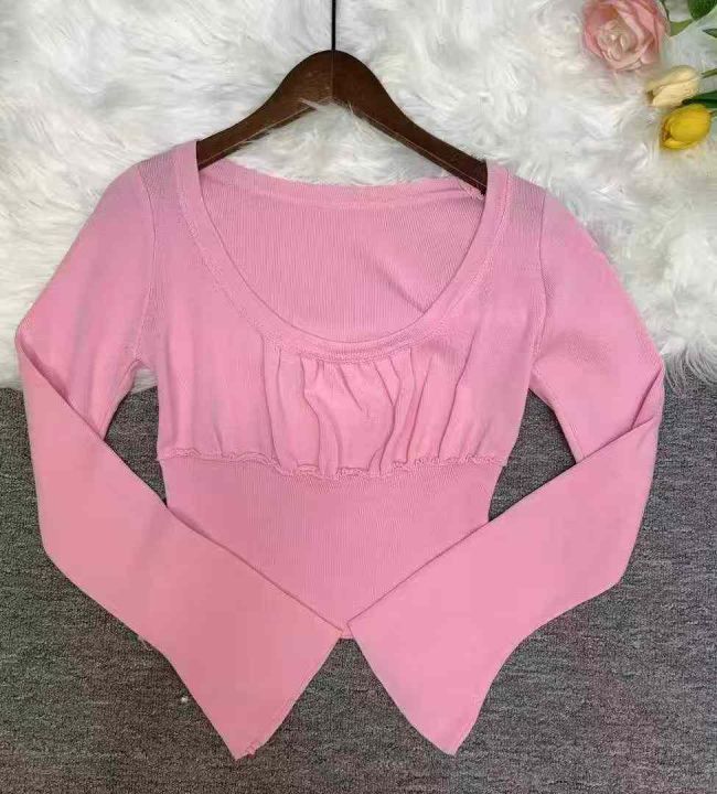 褶皱修身显瘦冰丝针织喇叭长袖T恤打底衫106件,独立包...