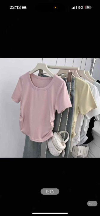 冰丝螺纹显瘦抽皱小蛮腰不规则短袖,侧边有抽皱设计,...
