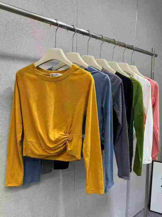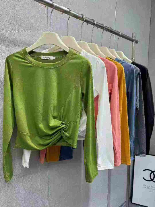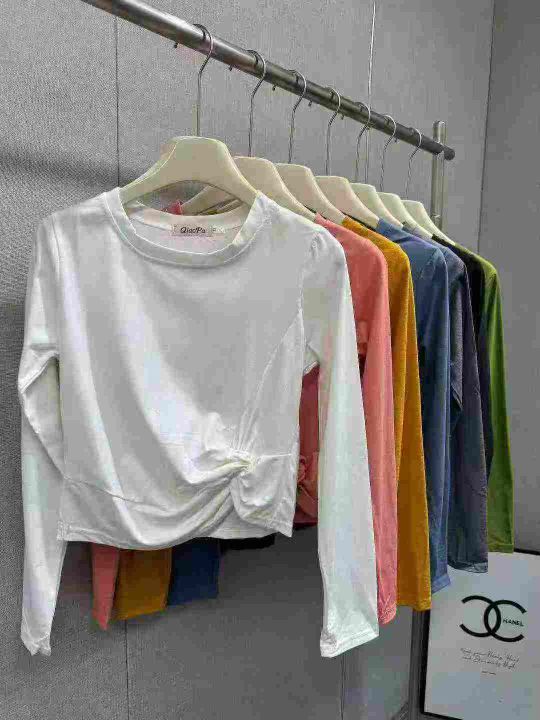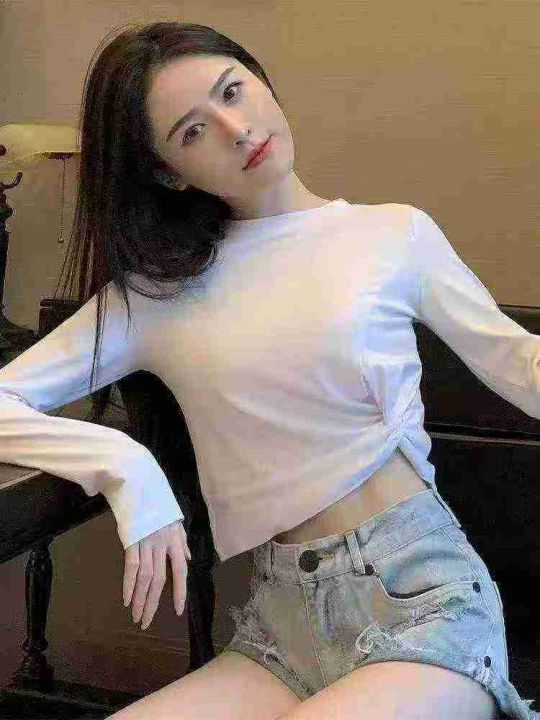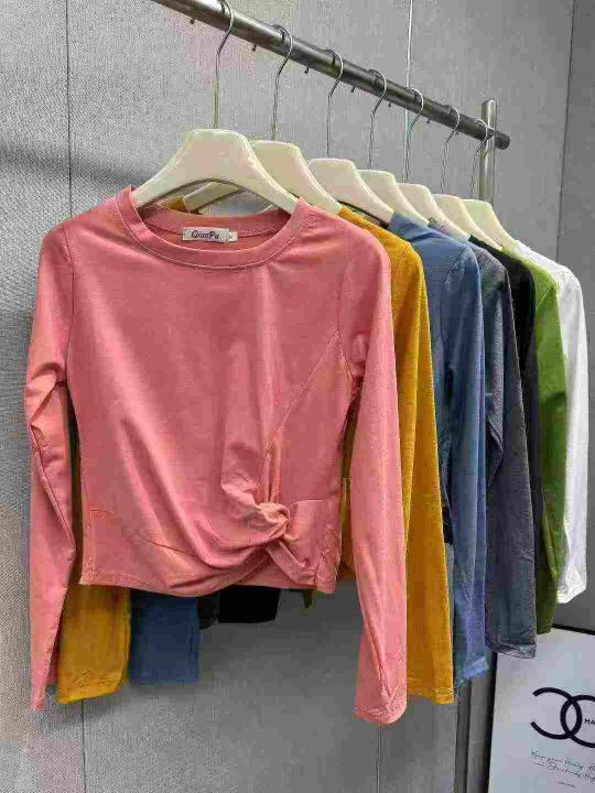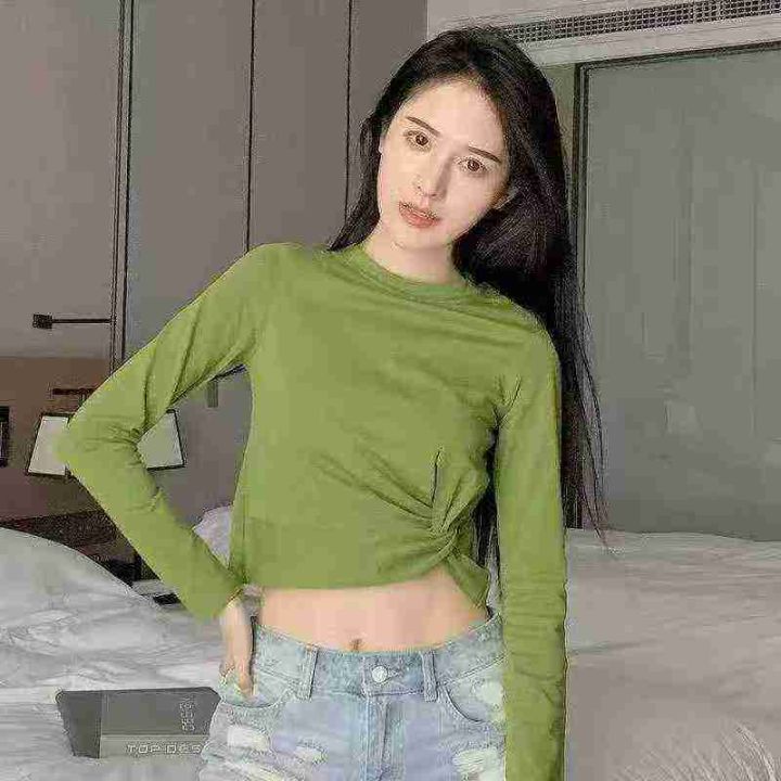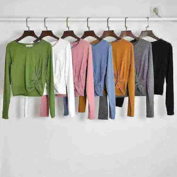 清1500件,外穿扭结上衣短款长袖t恤女秋韩版修身百搭性感纯棉不对称打结ins打底衫潮,码数m-2xl。