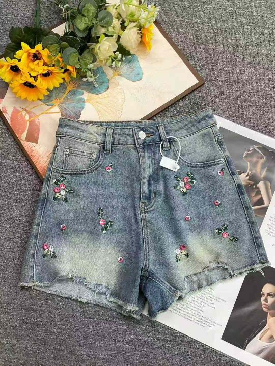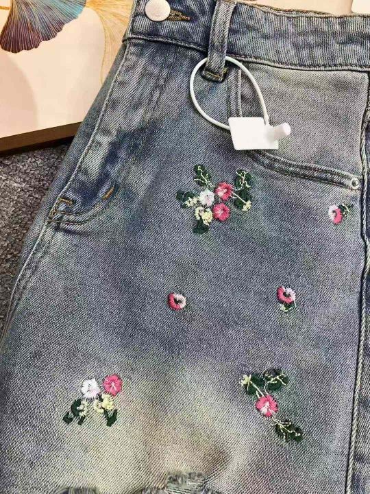 春意新款高弹力复古碎花刺绣牛仔短裤,独立包装带吊牌...
