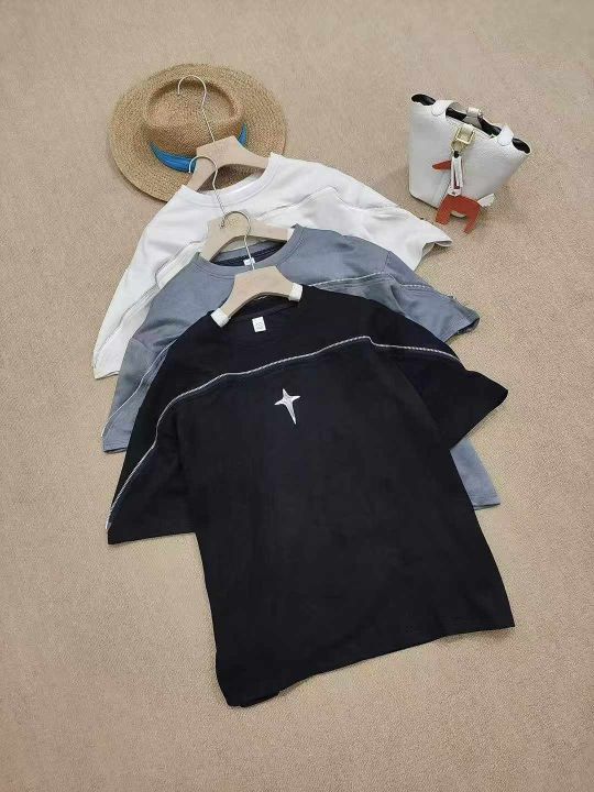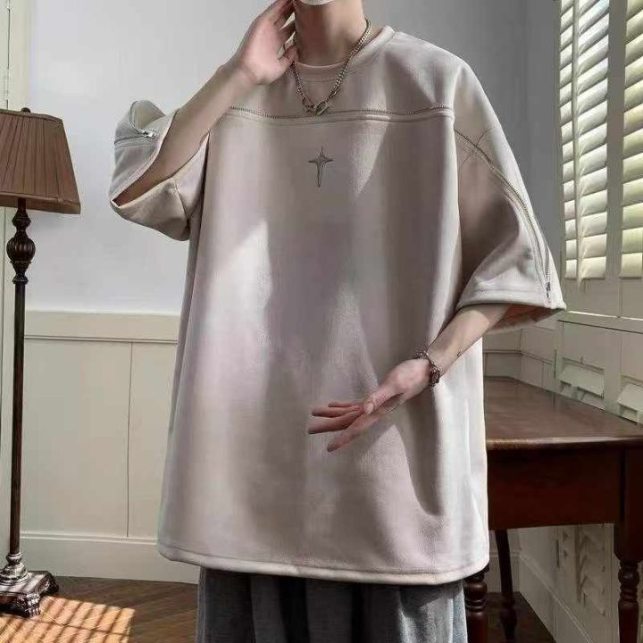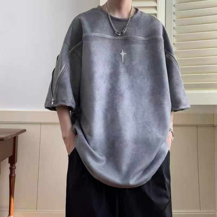 [月亮]:美式高街潮牌情侣款拉链麂皮绒短袖