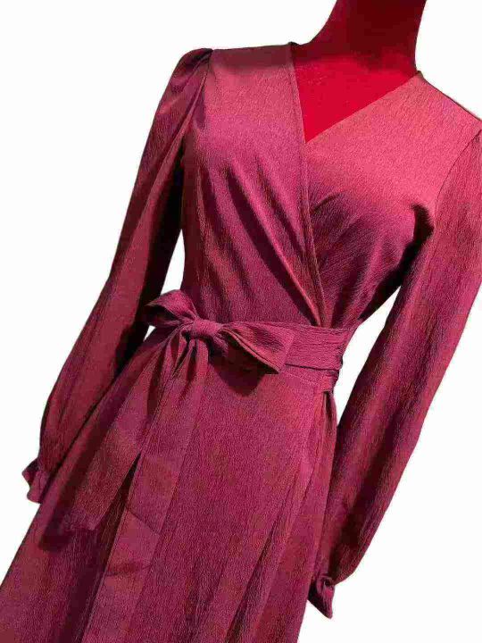 纯色裹胸款春秋季衩领束带灯笼袖长袖连衣裙
